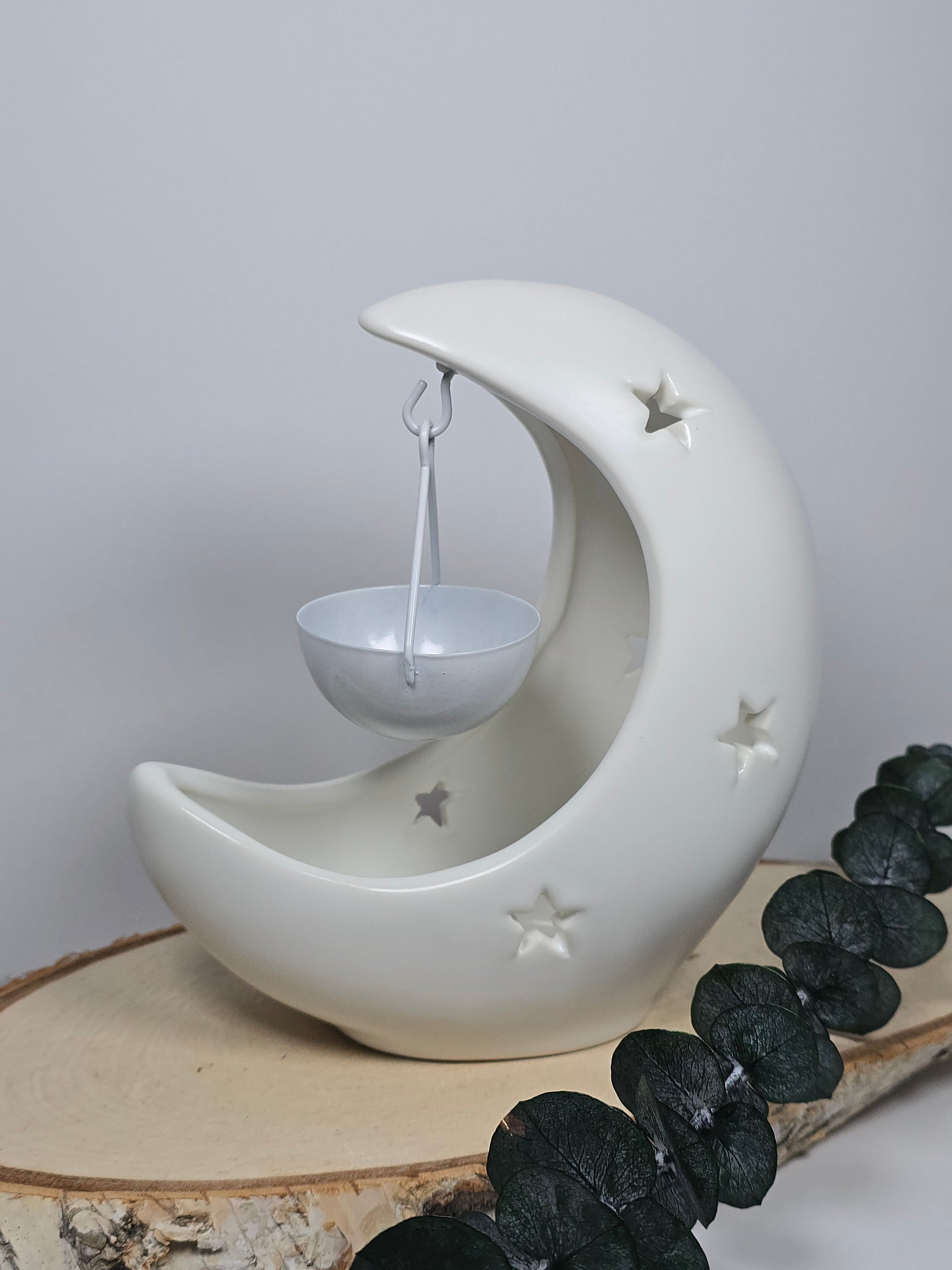 Die Lampe besteht aus hochwertiger Keramik und zeigt einen fein strukturierten Halbmond, der im Kerzenlicht besonders elegant wirkt. Die obere Schale eignet sich ideal für ätherische Öle, Duftöle oder deine Astral Eclipse Duftmelts.